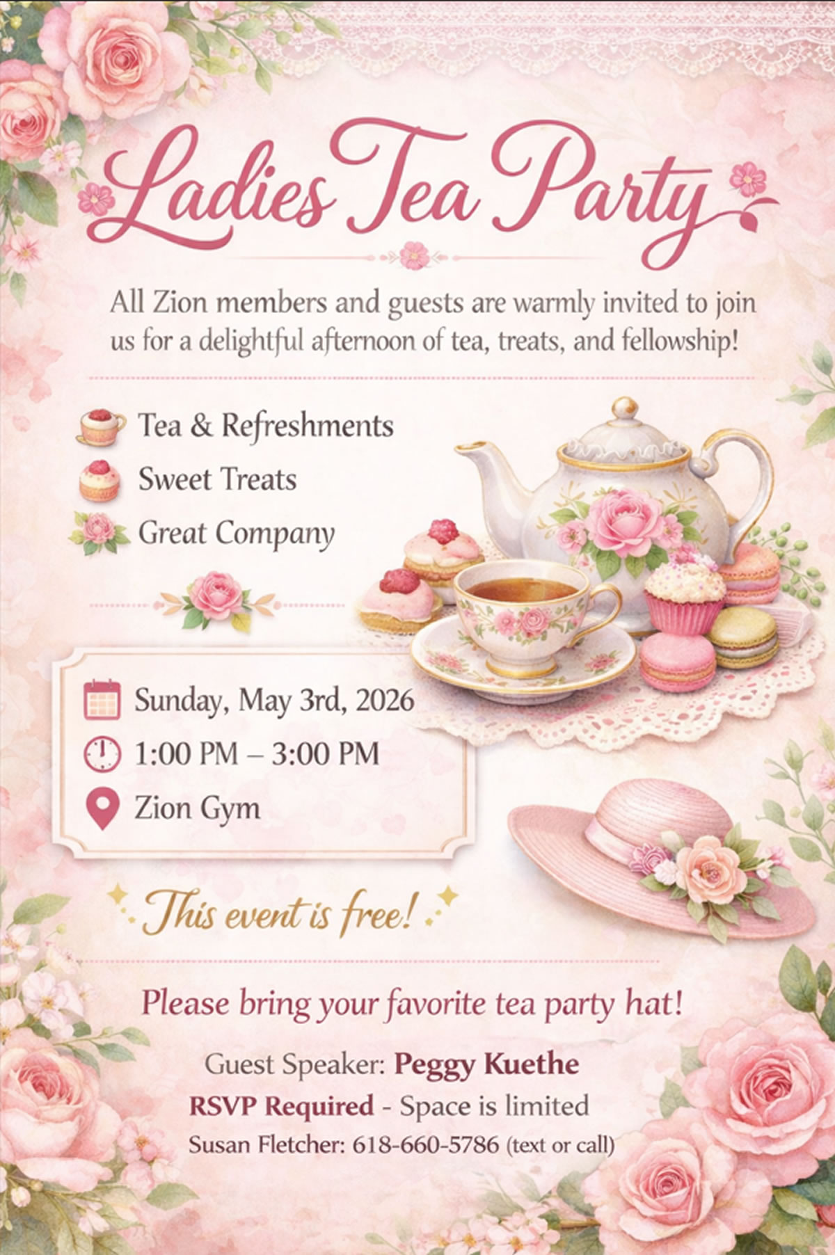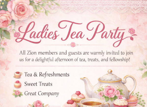 All Zion members and guests are warmly invited to join Zion for the Ladies Tea Party on Sunday, May 3rd, 2026.