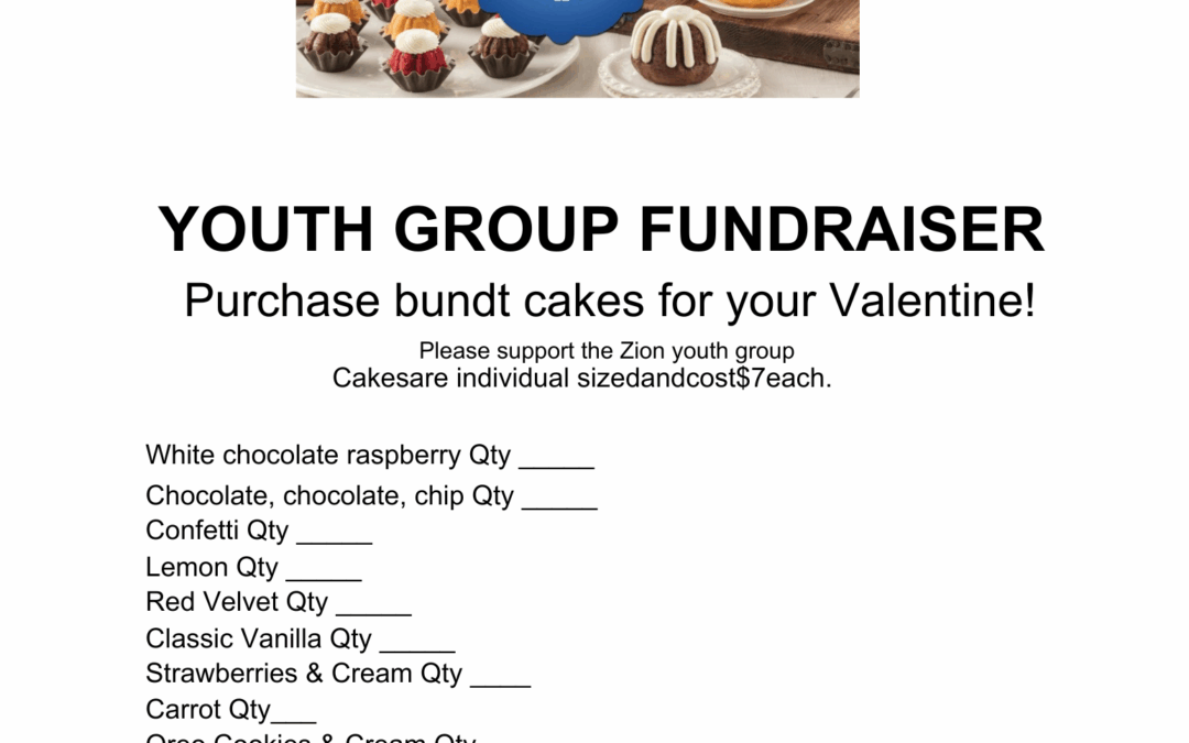Indulge your sweet tooth and support a wonderful cause at the same time! The Zion Youth Group is excited to announce a Nothing Bundt Cake fundraiser. Get your hands on these delicious cakes, priced at just $7 each. Your purchase will not only satisfy your craving but also help our youth programs thrive. Make sure to place your orders by Monday, January 26, and remember, payment is due with your order. Checks should be made payable to Zion.